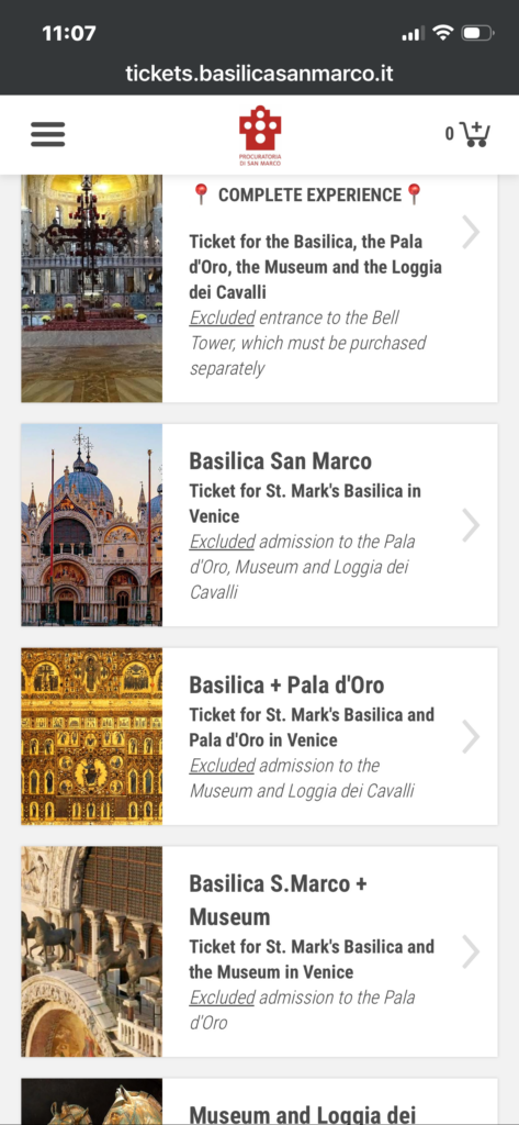 サンマルコ寺院の公式サイトでは、いくつかのチケットが用意されています。