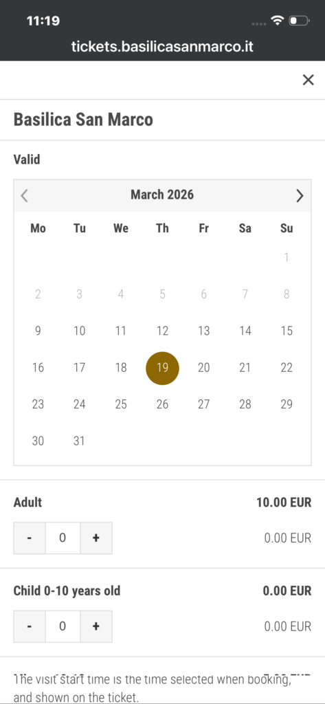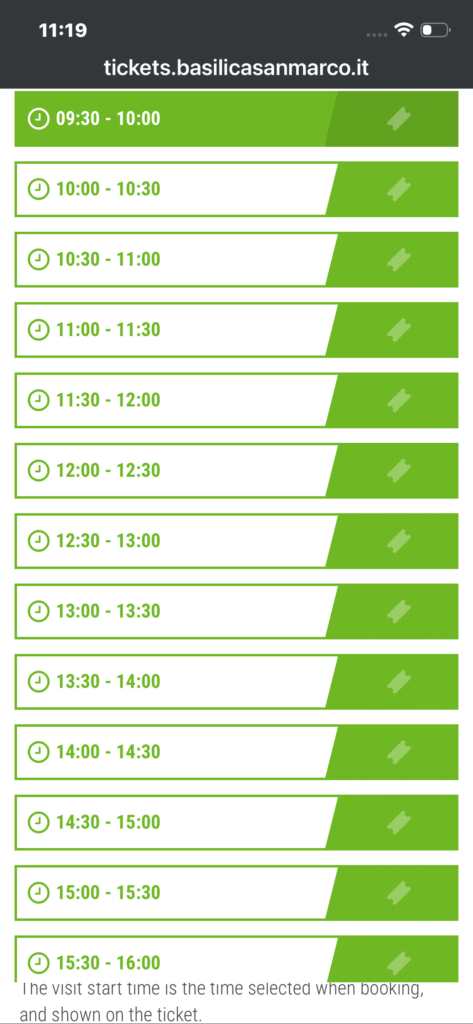 現在サンマルコ寺院はチケット予約制となっており、公式サイトからチケットを購入し、指定された時間に入場します。